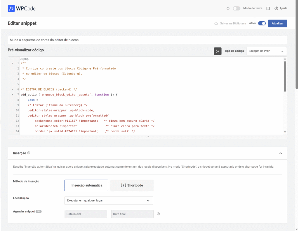 - Confirme que o tipo de código é Snippet de PHP.